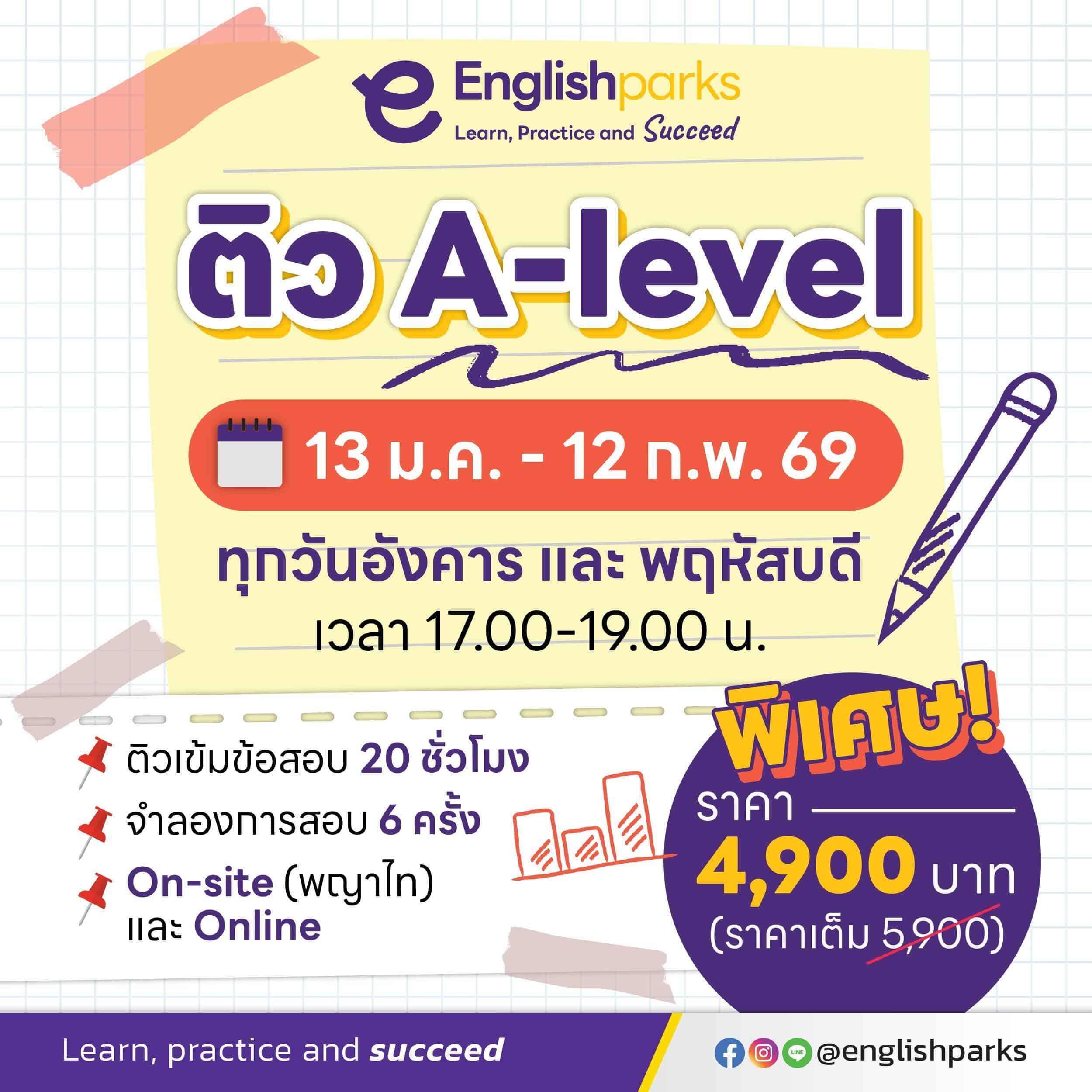 ทาง English Parks มีคอร์สติวภาษาอังกฤษที่เหมาะสมกับการติวเข้ามหาลัยหลากหลายคอร์สด้วยกัน ไม่ว่าจะเป็นคอร์ส Unlimited English for IELTS, Smart TOEIC, TU-GET, CU-TEP หรือคอร์สที่เน้นแกรมม่า เน้นการพูดและเขียนโดยเฉพาะ แต่หลักสูตรที่จะช่วยพัฒนาภาษาอังกฤษให้แก่นักเรียนที่ต้องการติว TGAT และติว A-Level ได้ตอบโจทย์มากที่สุดคือ คอร์ส Unlimited English for Exam